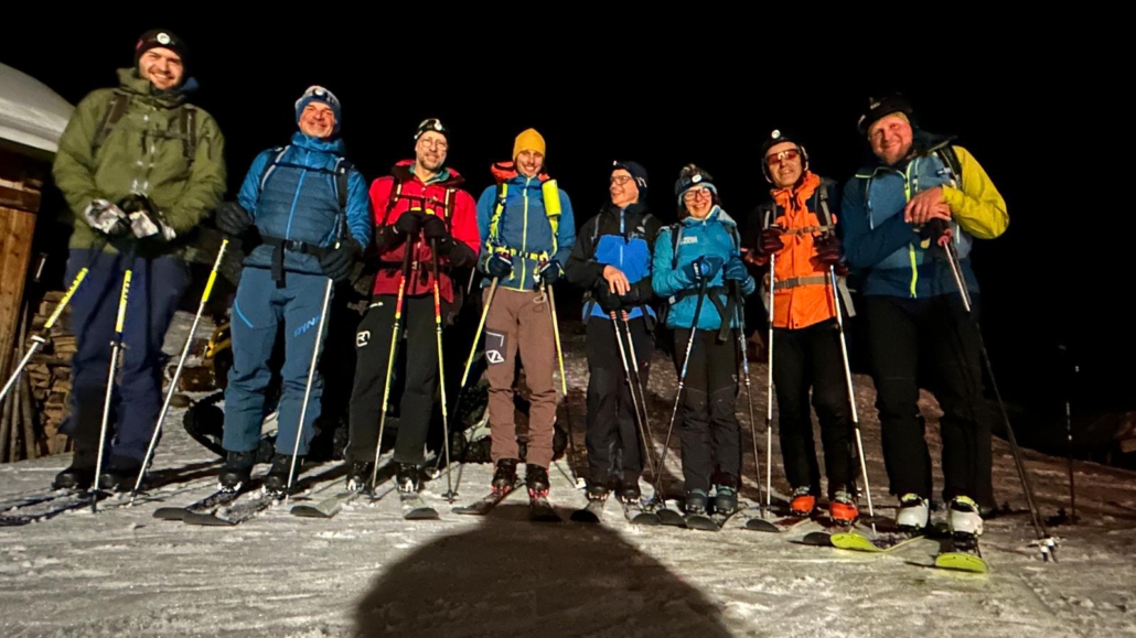 Nicht schlecht staunten wir, als wir nach rund 900 Aufstiegshöhenmetern an der Kreuzalm ankamen. Die Hütte war an diesem Abend bereits mit sehr vielen anderen Skitourengehern nahezu überfüllt. Das lag mitunter auch am guten Wetter und den ausgezeichneten Pistenbedingungen. Mit etwas Warten und Glück wurde dann aber doch noch ein großer Tisch frei und wir konnten den Tourenabend auf der Hütte bei Brotzeit und Bier mit Ratschen und guter Stimmung genießen.