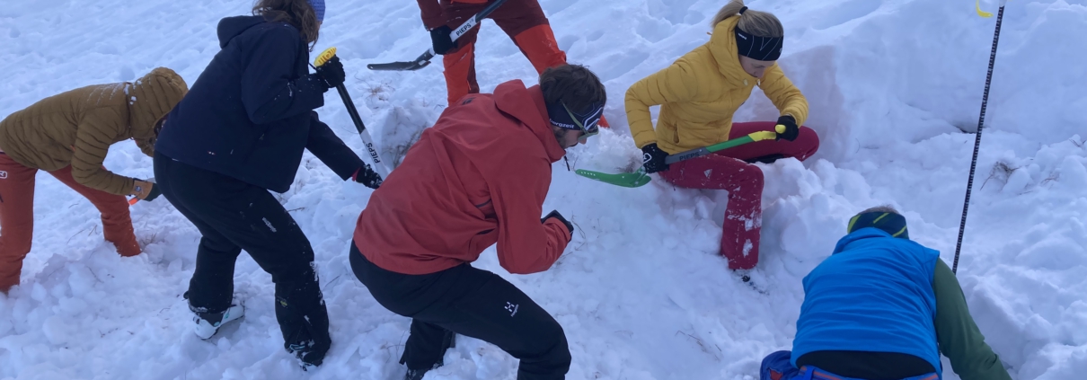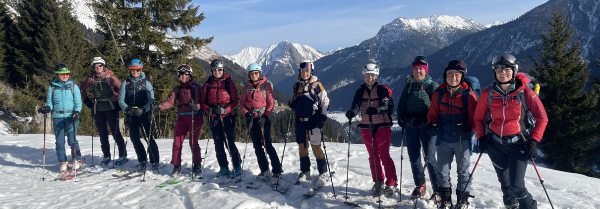 Bei der ersten kurzen Abfahrt bekamen wir bereits einen Vorgeschmack auf die zu erwartenden Schneeverhältnisse: es könnte gut werden! Der zweite Gipfel war das Rindalphorn mit 1.821m, hier mussten wir die letzten Meter zu Fuß gehen. Die südöstliche Abfahrt sah nicht sonderlich verlockend aus, sodass Peter seinen ‚Geheimjoker‘ zog und uns anbot, dass wir nordöstlich in einer steilen aber durchaus schneereichen Rinne abfahren könnten, dadurch allerdings ein paar Meter mehr aufsteigen müssten. Das haben wir gerne in Kauf genommen und es hatte sich gelohnt, zumal die Rinne zuvor kaum befahren wurde.