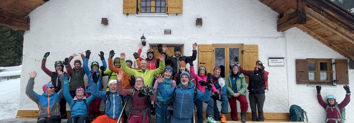 Groß war das Interesse für die legendäre Peitinger Skitour auf die FeldernAlm. Eine starke Gruppe von 21 Teilnehmern startete von Ehrwald auf den Issentalkopf um dann nach einer rassigen Abfahrt zur Peitinger Feldernalm abzufahren. Dort gab es traditionell Weißwürste mit Starkbier und Zopf von der Holl Pankratia. Tolle Gespräche und Hüttenstimmung beim Kaminfeuer taten das übrige dazu. Nach dem Gruppenfoto vor der Feldernalm und Blick zurück auf die toll renovierte Hütte ging es wieder zurück ins Tal.