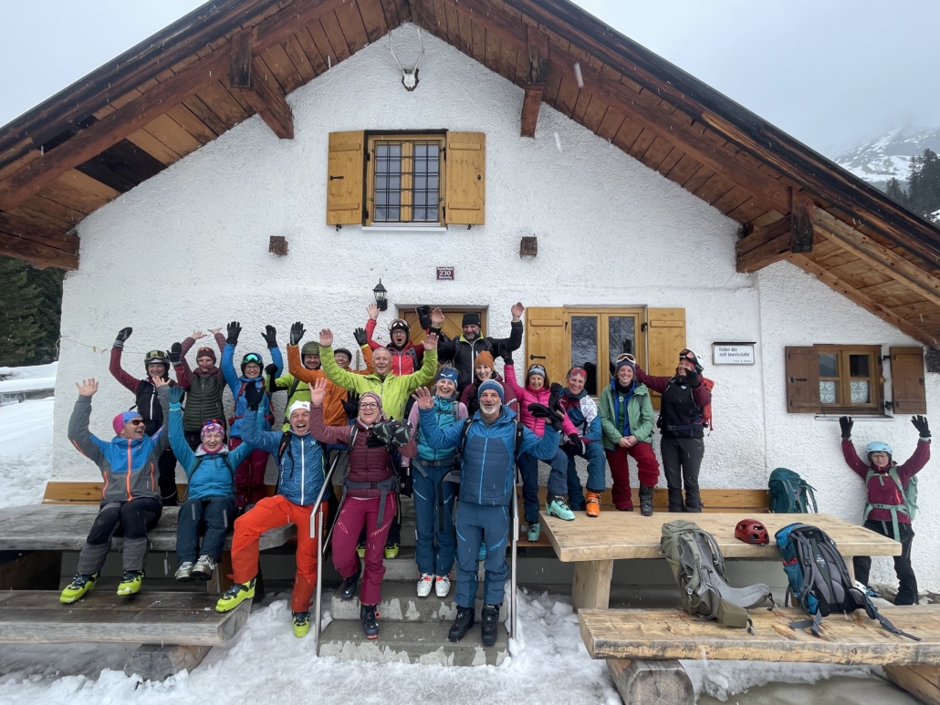 Groß war das Interesse für die legendäre Peitinger Skitour auf die FeldernAlm. Eine starke Gruppe von 21 Teilnehmern startete von Ehrwald auf den Issentalkopf um dann nach einer rassigen Abfahrt zur Peitinger Feldernalm abzufahren. Dort gab es traditionell Weißwürste mit Starkbier und Zopf von der Holl Pankratia. Tolle Gespräche und Hüttenstimmung beim Kaminfeuer taten das übrige dazu. Nach dem Gruppenfoto vor der Feldernalm und Blick zurück auf die toll renovierte Hütte ging es wieder zurück ins Tal.