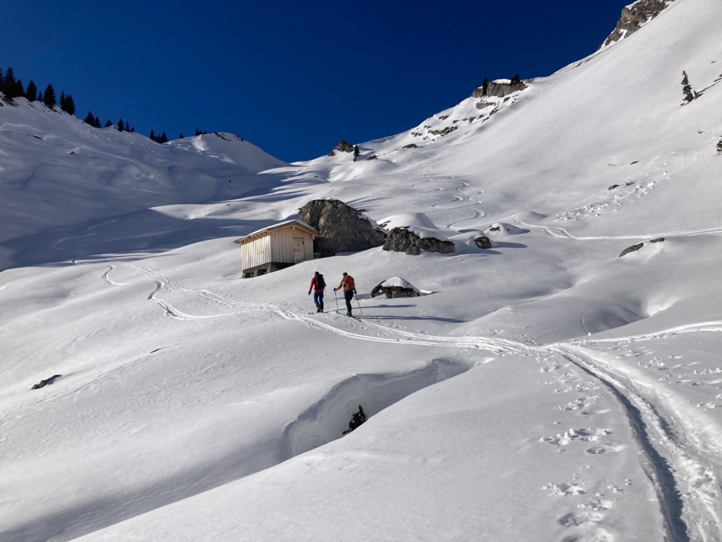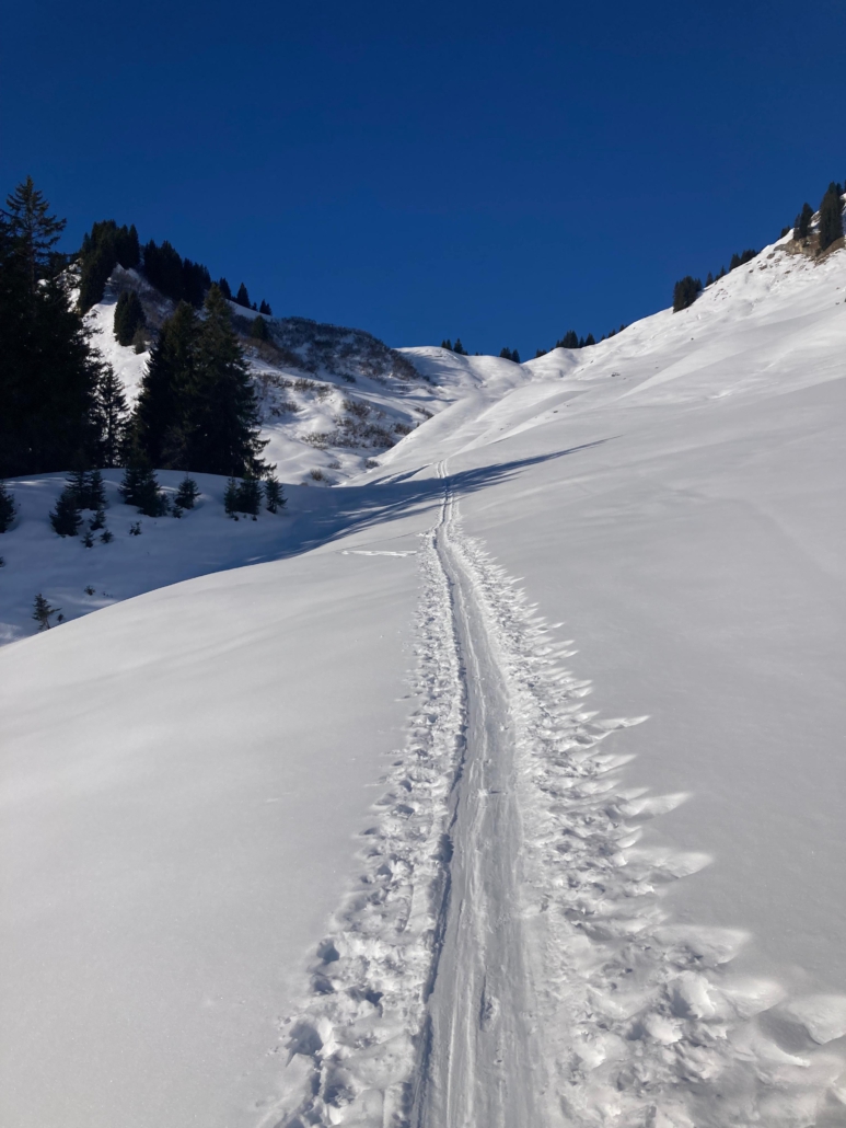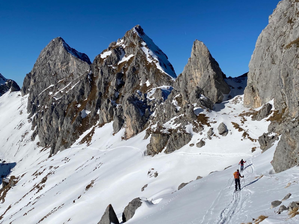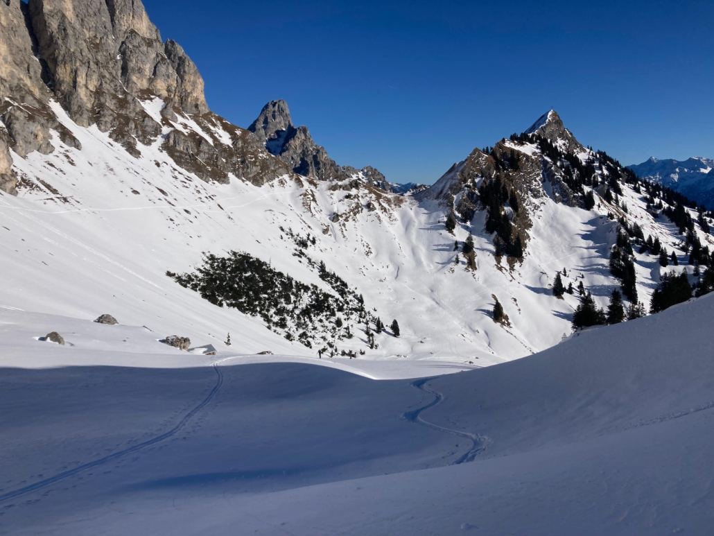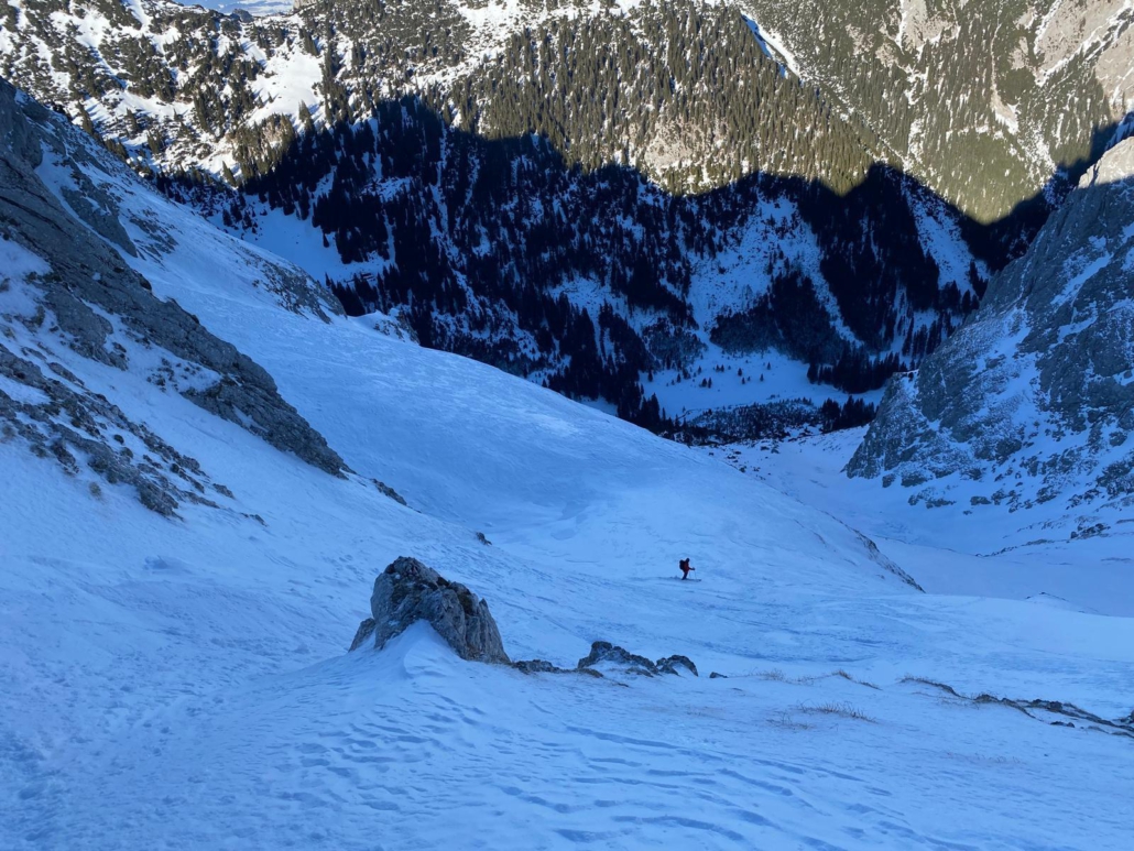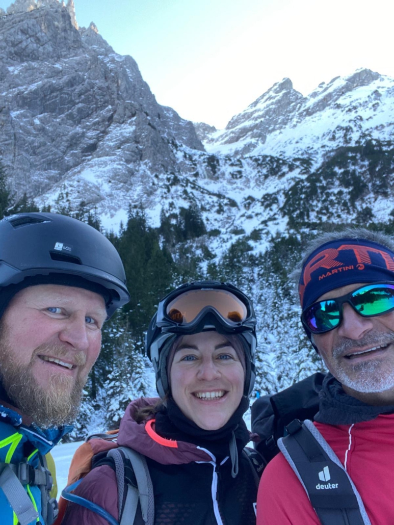Mit einer umsichtigen Routenwahl und angepasstem Fahrstil meisterten wir dann auch diesen Tourenabschnitt noch gut. Die restliche Abfahrt über die Forststraße hinunter zur Bärenfalle war wiederum sehr gut zufahren und so kümmerte es uns auch nicht, dass wir am Ende auf den letzten 150 Höhenmeter nochmal die Ski schultern mussten. Zusammengefasst war es für alle Teilnehmer der 3 köpfigen Gruppe eine technisch anspruchsvolle, spannende Skitour und zugleich auch ein tolles Erlebnis in der traumhaften Gebirgskulisse der Tannheimer Berge. Mit dabei waren Daniela und Martin sowie Peter als Tourenführer.