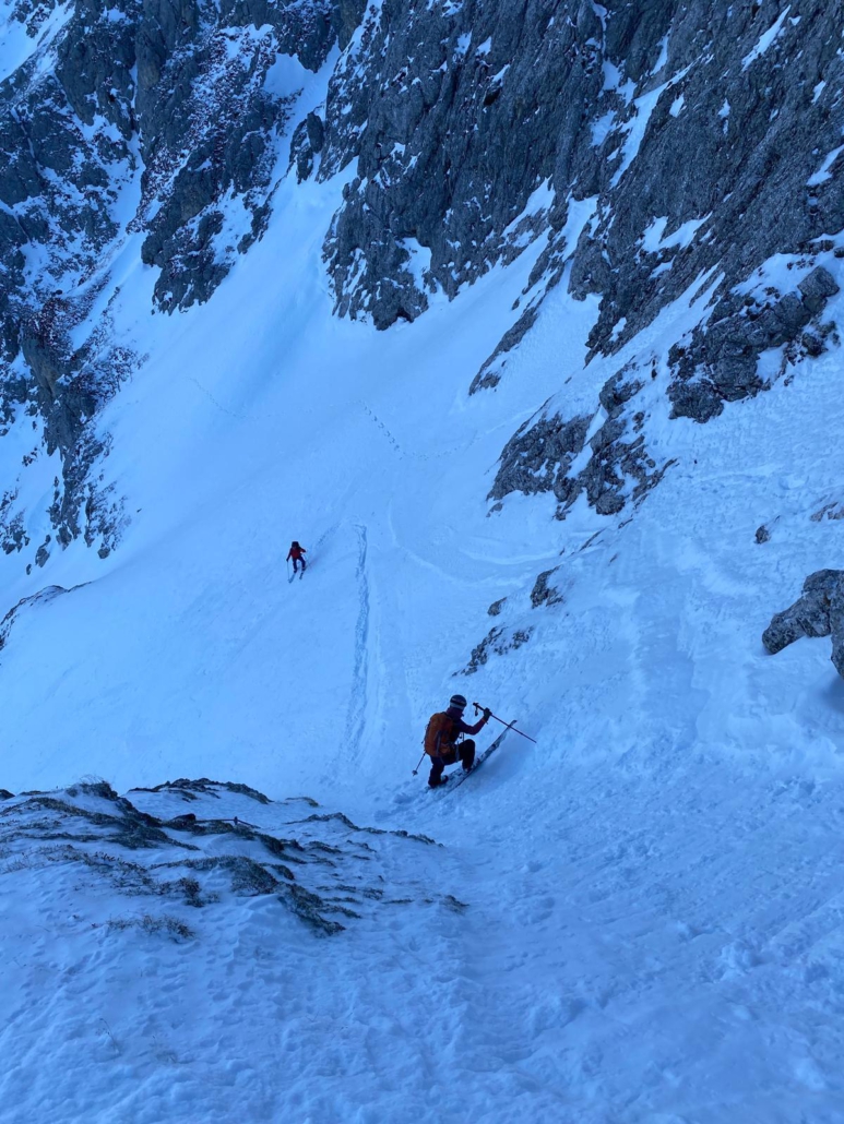 Bei allerbestem, sonnigen Bergwetter und relativ sicheren Lawinenbedingungen in allen Expositionen fanden wir auf dem Weg dorthin sogar noch eine schöne Abfahrt in einer langen und unverspurten Pulverschnee-Rinne vor. Auch der Aufstieg hoch zur Nesselwängler Scharte zeigte sich von den Bedingungen her von seiner besten Seite und ist immer wieder ein landschaftliches Highlight auf dieser Tour.